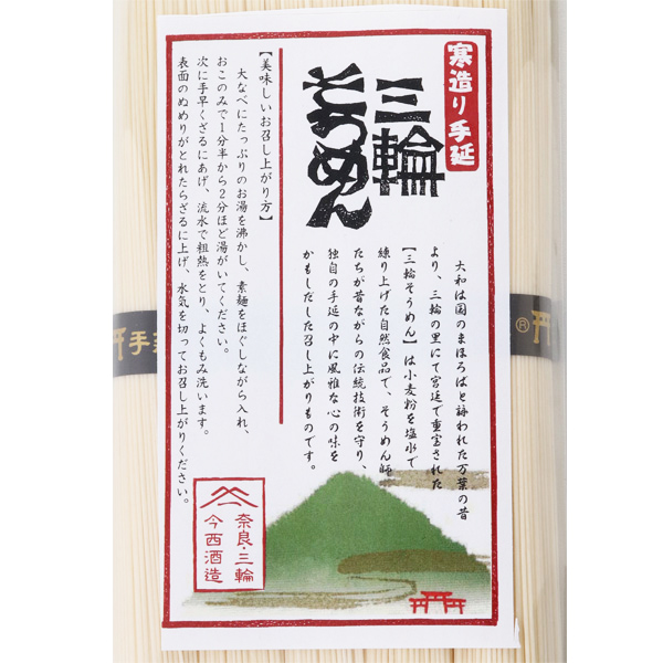 三輪素麺とは、三輪で製造した素麺が名乗ることのできる地域ブランドです。酒同様に作り手で大きく味わいが異なります。三輪には多数の家族経営小規模生産者が存在する中、今回お届けする素麺は、今西酒造先代の同級生が全行程手作りにこだわった手延べ素麺です。今西酒造の横にある製麺所にて作られており、みむろ杉と同じ仕込み水となっています。注意事項