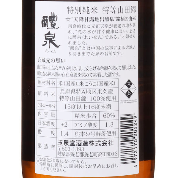 醴泉の定番、特別純米がリニューアル。一般的に大吟醸以上で使用される上質なお米を半分近く磨いて仕込んだ意欲作。山田錦のきめ細かさと透明感のある味わい、上品な香りと迫力のある余韻を楽しめます。蔵紹介