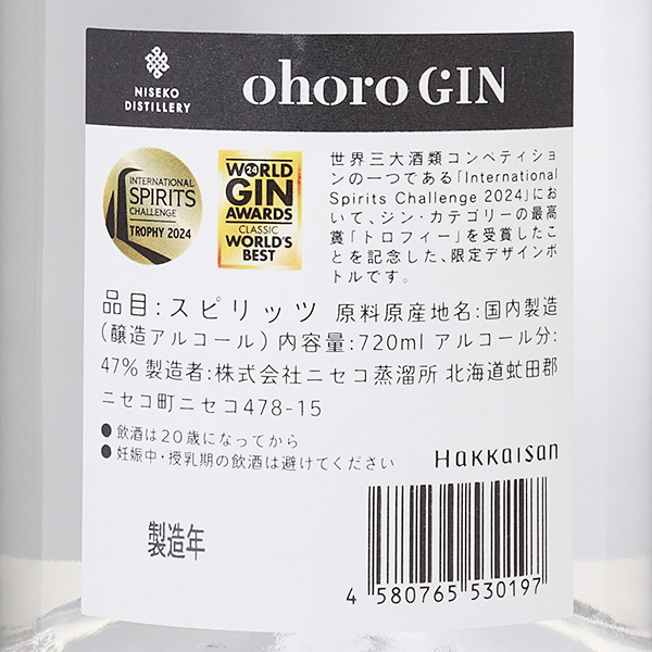 ohoro GIN 記念ラベル 47度 / 八海山 ニセコ蒸溜所