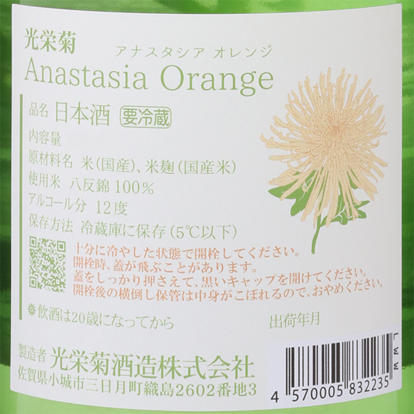 同蔵の商品「アナスタシアグリーン」の優しい甘みと、「黄昏オレンジ」の爽やかな柑橘感を同時に表現すべく挑戦した一本。ほどよい酸味と甘みが調和し、口に含むと穏やかな柑橘の香りがふわりと広がります。開栓直後はやや苦味や渋味を感じますが、時間の経過とともにまろやかさが増し、クリアな柑橘の風味をお楽しみいただけます。蔵紹介