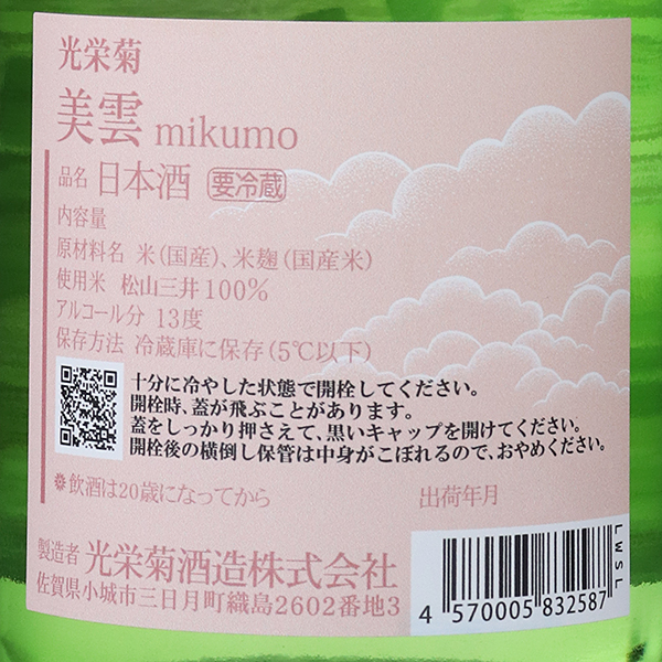 今シーズンは良縁があり無農薬・松山三井を使用することができました。この貴重なお米を45%まで磨いたことで美雲(みくも)の特徴的な甘みがありながらも、クリアでスムーズな飲み心地のお酒に仕上がっています。お酒に弱い杜氏が、コメントを書くための試飲でついつい2合も飲むほどの自信作です。イチゴの赤くて甘い果肉部分を永遠に食べているかのようなお酒で、甘さの後少しの酸味を感じながらすっと切れていきます。透明感があり苦味や渋味などの引っかかるものが何もない優しいお酒です。蔵紹介