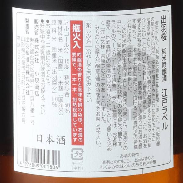 酒蔵とみなさまの心をつなぐ美酒江戸の文様吉原つなぎを日本の伝統色江戸むらさきでデザインしました。出羽燦々を50%まで磨き、山形酵母で醸した出羽桜の新定番です。パイナップルやマンゴーを思わせる甘くふくよかな香りと、口当たりに軽やかな甘味と膨らむ旨味、後からほのかなミネラル感が続く柔らかい味わいです。蔵紹介