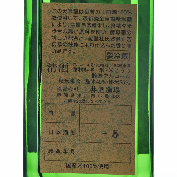 開運の杜氏歴30年、能登四天王の一人と称された波瀬正吉杜氏の技を伝承し、創り出された、蔵元最高級の大吟醸です。兵庫県産山田錦を35%まで磨いて醸した極上の一本。上品ながらもなめらかな米の風合いある香りに、きめの細かい舌ざわりとほど良いキレのある酸が全体を引き締める、綺麗な味わいです。注意事項