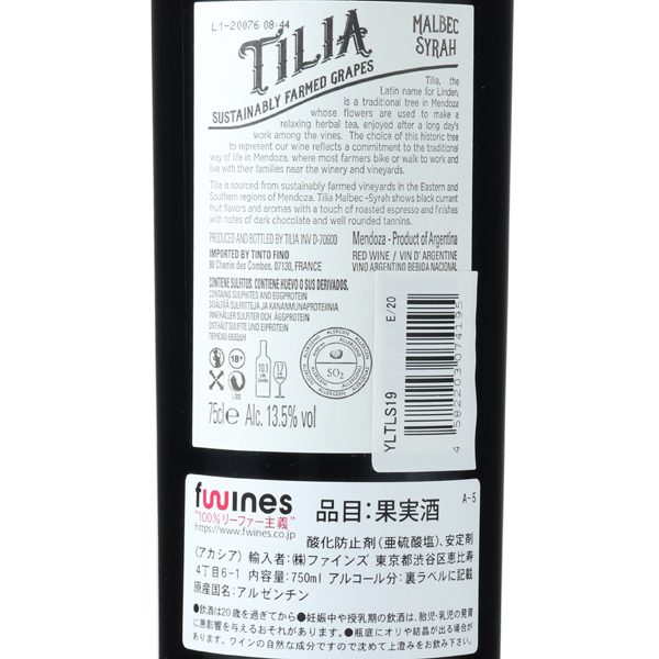 「TILIA・ティリア」はボデガス エスメラルダ社が有するスタンダードレンジのワイン。「ティリア」はブドウ畑で働く農夫たちが作業の合間にその木陰で憩い、語らう木「菩提樹」のことで、ラベルにも菩提樹の木が描かれています。