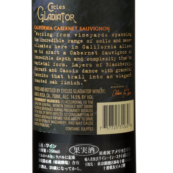 果実味が豊富な典型的なカリフォルニアン・スタイルで、斬新なデザインのラベルも話題になり、アメリカを始め世界中で愛されるブランドとなっています。ラベルはベル・エポック時代の現存するポスターで、当時の発明品である自転車とそれによって自由を得た女性が「Gladiator(剣闘士)」として描かれています。カリフォルニアの束縛されない大自然の美しさが表現された芸術作品です。