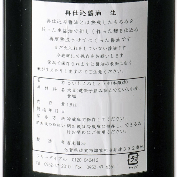 佐賀市諸富町で嘉永二年(1689年)創業。東に筑後川、西に佐賀平野、南に有明海、北に天山、背振山という風土の中で醤油づくりをしています。関東、関西のお醤油にくらべると、甘口のお醤油になっています。再仕込み醤油とは、通常食塩水で仕込むところを火入れしていない生醤油で仕込む事からこの名前が付きました。色・香り・味ともに濃厚な味わいで、特に寿司・刺身・冷奴などにオススメです。