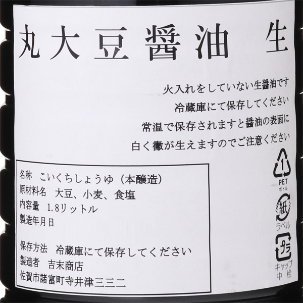 佐賀市諸富町で嘉永二年(1689年)創業。東に筑後川、西に佐賀平野、南に有明海、北に天山、背振山という風土の中で醤油づくりをしています。関東、関西のお醤油にくらべると、甘口のお醤油になっています。丸大豆を使い、火入れをせず充填した生醤油です。注意事項