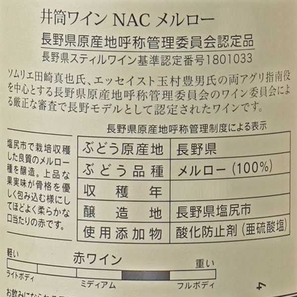 NAC認定。ふくよかで優しい桔梗ヶ原のメルロー。ふくよかな果実味がタンニンなどの骨格を包み込む様にして広がる柔らかい呑み口です。NAC=長野県原産地呼称管理制度農産物やその加工品の原産地が長野県であることを保証する制度で、2002年から導入されました。ワインの場合、信州でとれた葡萄を使い、信州で醸造、瓶詰され、さらに厳しい官能審査(色・香り・味など)に合格したものだけが認定されます。蔵紹介