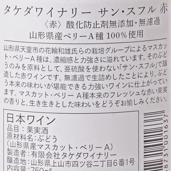 日本で改良されたベリーA種。しっかり栽培・醸造したものは濃縮感、力強さがあります。特に良質のぶどうをサン・スフル(仏語で亜硫酸なしの意味)で仕上げました。濾過を行わず生詰めしたことで、ぶどう由来のにごりや澱、酒石がみられ、それらが格別の風味を醸し出します。蔵紹介