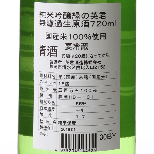 緑の英君 純米吟醸 五百万石 無濾過生原酒