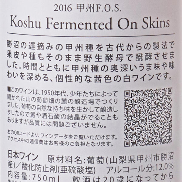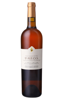 淡くやわらかな白ワインとは正反対で、F.O.SとはFermented on Skins=果皮の上で発酵の事。流通する甲州種で造られたワインはその多くが、淡く軽く飲みやすい物です。しかしながら本来、甲州種の実は渋みが強く力強さを感じさせる特徴を持っています。これまで柔らかく飲みやすい白ワインに仕上げるため、醸造過程において葡萄の持つ特徴を削いできたのかもしれません。そこで可能な限り葡萄から香りと成分を抽出し、赤ワインをつくるように皮と共に発酵させました。他の白ワインとは違う、深い色、広がりのある複雑なアロマ、渋味がつくる口当たりの強さを有するワインになりました。複雑でナチュラルな美味しさを持つ、オレンジ色のワインです。オーソドックスな白ワインとは異なりますので、それをお求めの方はギャップを感じてしまうかもしれません。気の合う方とのんびりお楽しみ下さい。