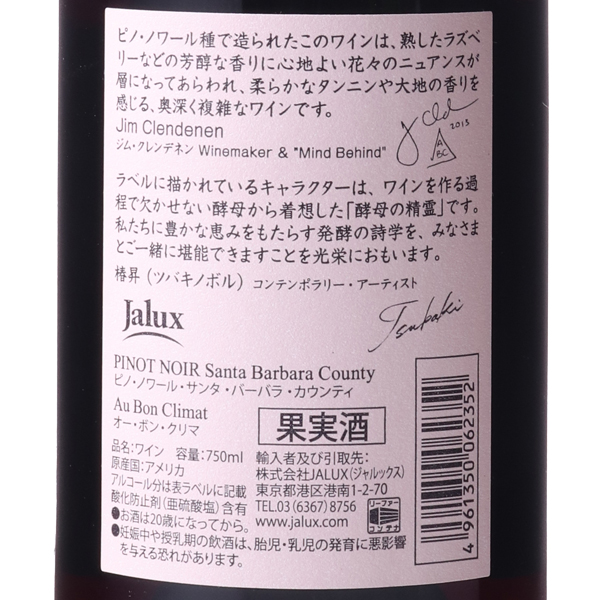日本限定ワイン。ラベルに描かれているキャラクターは、ワインを作る過程で欠かせない酵母から着想した「酵母の精霊」です。そのデザインは、現代美術家の椿昇氏が初めてワインのラベルデザインとして手掛けたものです。サンタ・バーバラのテロワールをよく表現したピノ・ノワールで、熟したラズベリーなどの芳醇な香りに、心地よい花々のニュアンスが層になって現れ、柔らかなタンニンや大地の香りを感じる奥深いワインとなっています。蔵紹介
