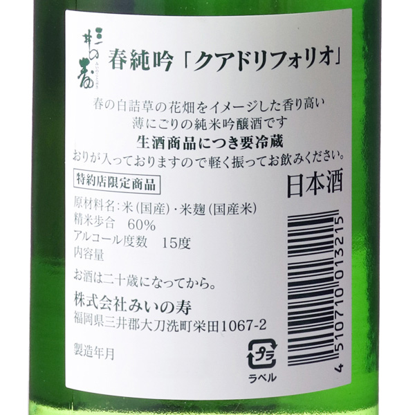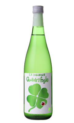 クアドリフォリオとはイタリア語で幸運の四つ葉のクローバーの事で、春らしいシロツメ草の花畑をイメージした薄にごりの純米吟醸です。吟のさとを60%まで磨き、香り高い純米吟醸を薄にごりの状態で瓶詰めしています。フレッシュなイチゴや洋ナシの香りと、口当たりに柔らかい甘味と軽快な酸があり、きれいな含み香のある気持ちよい味わいです。蔵紹介