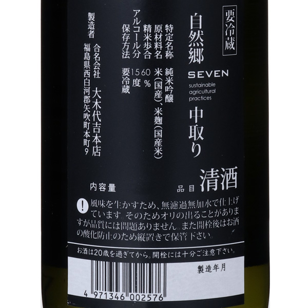 自然郷の「セブン」シリーズは、福島県が独自に開発した「うつくしま夢酵母(F7-01)」という酵母を用いて、「食事に寄り添うお酒」をコンセプトに醸したお酒です。自然郷セブンの香りと味わいの調和のとれた中取り部分を贅沢に瓶詰した、年1回限定発売の商品です。マスカットやメロン、白桃の様な香りに、ピチピチ爽やかな口当たり。クリアでスッキリとした甘味を感じながら、余韻はなめらかな口当たりで飲み飽きしない味わいです。蔵紹介