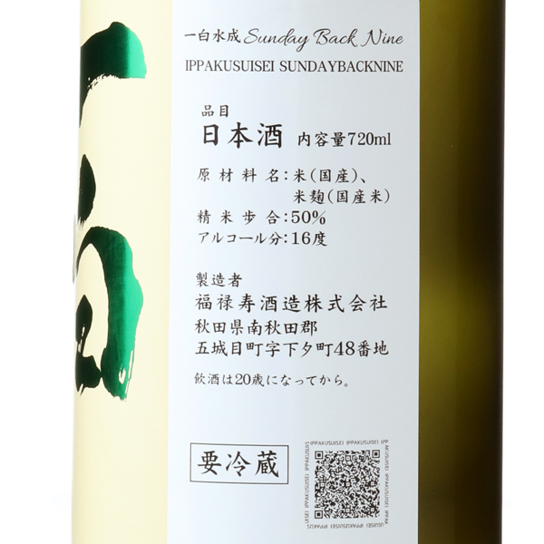 蔵元と酒米生産者が一体となって運営する五城目酒米研究会のメンバーが作る優良な酒米を使用して醸されます。香り穏やかで米のたっぷりとした旨味が引き出された、ジューシーな印象。ゆっくり、じっくりと味わって下さい。Sunday Back Nineとはゴルフ用語で大会最終日の日曜日、最終9ホールを意味します。勝負がかかった大切な場面に立ち向かう多くの方々へのエールが込められた日本酒。贈りものとしても喜ばれます。蔵紹介