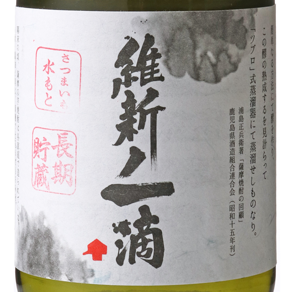 維新ノ一滴は杜氏・安田宣久氏が、明治維新の頃に飲まれていた自家用焼酎の味を復元しようと取り組んだ焼酎です。当時行われていた水もと造りに挑戦し、ツブロ式蒸留器を再現して蒸留しました。薩摩の英雄である西郷さんや大久保さんが酌み交わしたであろう焼酎に想いを馳せて味わってみてください。※当時行われていた水もと造りは、生米と蒸米を水に浸け、乳酸菌を繁殖させてから仕込む日本酒の菩提もとという醸造技術をベースとしていました。この焼酎では文献に倣い、ふかしたさつまいもに水を加えて数日おいた後、黄麹を加えて仕込みました。