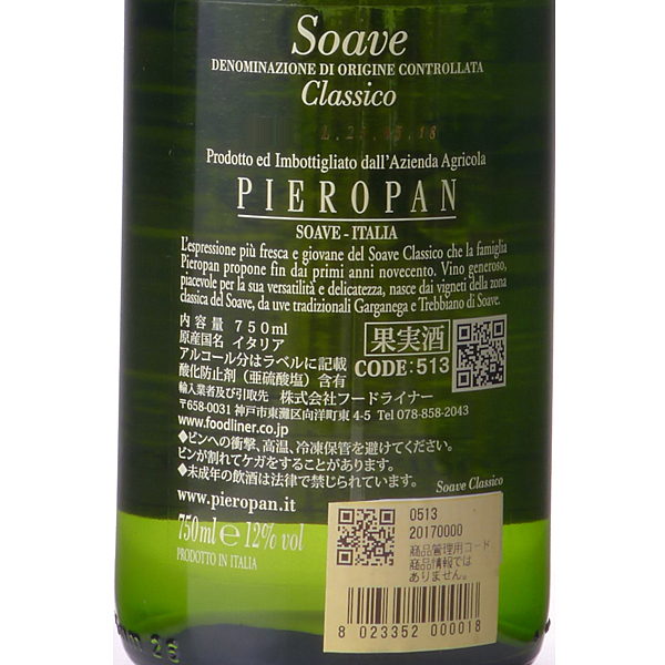 輝きを帯びた淡い麦藁色。エレガントかつフレッシュな果実香でブドウの花やサクランボ、サンブーカの香りが特徴的。酸味と新鮮な果実味のバランスが良く、素材を活かした魚介類の料理に良く合います。特に生やグリルした甲殻類で、レモンを搾って食べる料理などに最適です。使用品種:ガルガーネガ、トレッビアーノ・ディ・ソアーヴェ