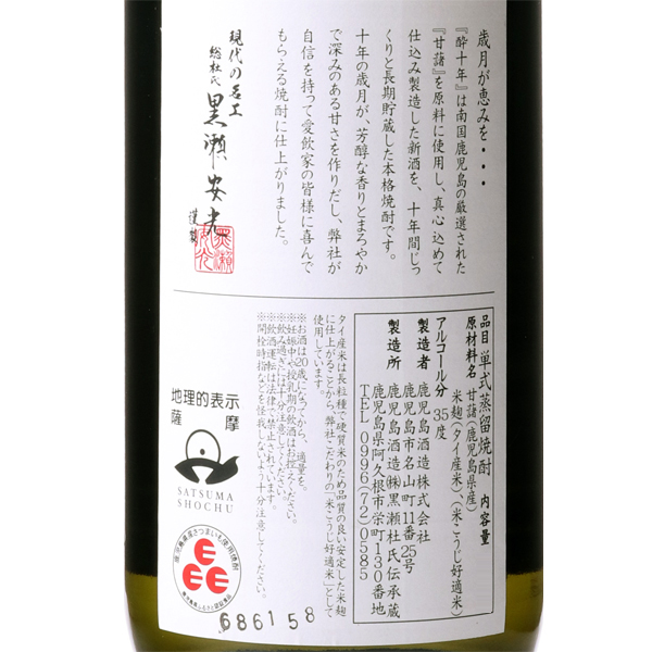黒瀬杜氏伝承蔵の代表銘柄であるさつま諸白を丹精こめて10年間育て上げた逸品です。蔵人の心配りを日々受け続けた10年の歳月。時間の経過と蔵人の手入れにより、えも言われぬ芳醇な香りと穏やかで丸みを帯びた熟成の仕上がりとなっています。蔵紹介