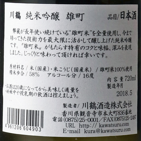 川の流れの如く、素直な気持ちで呑み手に感動を川鶴酒造は明治4年、1871年創業。蔵の裏に流れる清らかで豊富な水を湛える清流財田川に、鶴が舞い降りたことから初代蔵元が酒名を川鶴と命名しました。財田川は地元では別名「宝田川」とも呼ばれ、田に宝をもたらす水源とされています。螢が飛び交う財田川の地下伏流水と、讃岐平野の水田地帯で原料となる酒米、地元で収穫される魚介類や山菜などの料理とマッチするよう、出すぎず引きすぎずの関係を大切に、芳醇で旨味が最大限に引き出され、力強くて爽やかな、そして奥深く心地よい余韻が楽しめるお酒を醸しています。