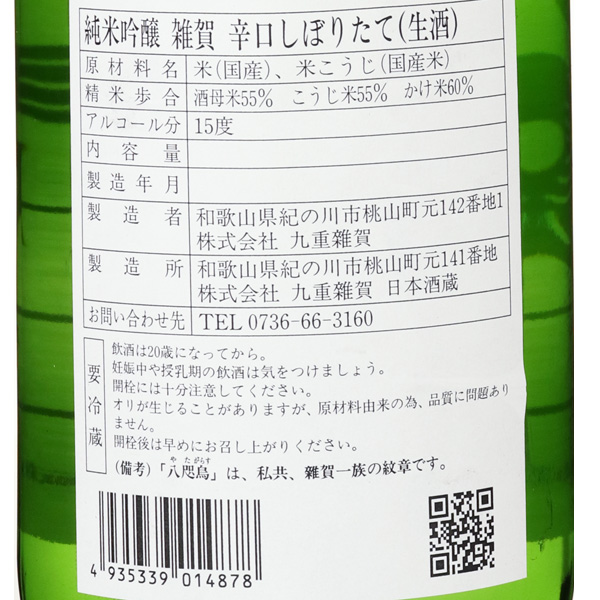 お酢と日本酒を両方醸す日本唯一の蔵。明治41年、1908年創業。桃の産地で有名な、和歌山県紀の川市に蔵はあります。もともとはお酢を造っていた蔵元だが、良いお酢を造る為には主原料となる酒粕から一貫して造るべきという考えから日本酒の製造も始めました。ここ最近は特に酒質向上が目覚ましく、蔵でも改革が進んでいる。しっかりとした旨みを残しつつ綺麗な酒質にこだわったラインナップを是非、雑賀のお酢で作った料理と合わせてみていただきたいです。
