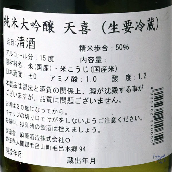 日本酒だけでなく様々なお酒を醸し注目を集める蔵元明治15年、1882年創業。初代創業者、麻原善次郎は滋賀県琵琶湖の畔に生まれ、青梅地方の酒蔵での奉公後、現在の埼玉県西部、自然が残る奥武蔵地方の毛呂山町にて開業しました。主要銘柄「琵琶のさゝ浪」のほか、梅酒やリキュール、ワイン、ビールなど多岐にわたる酒類を醸す多彩な蔵元です。新銘柄「天喜」は「綺麗で食事に合わせやすい味わい」と「コストパフォーマンス」を追求したブランドです。飲んだ人が笑顔になれる、心地よい味わいをお楽しみ下さい。