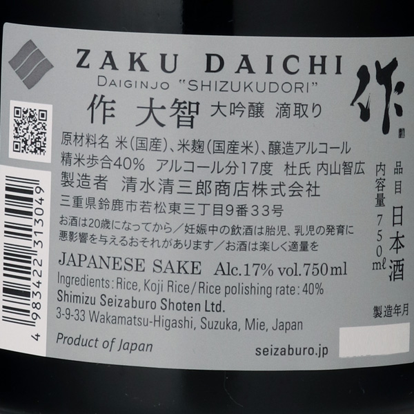香りの高い大吟醸の滴取りです。厳選された三重県産米を鈴鹿川の伏流水を使い低温でゆっくりと醸し、華やかな香りが蔵に満ち溢れた頃、袋に詰めたもろみを余分な力を加えずに、したたり落ちる滴のみを集めて瓶に詰めました。その香りと味わいは豊かに口中に広がりますが、後味はすっきりとしています。冷やしてお召し上がりください。注意事項