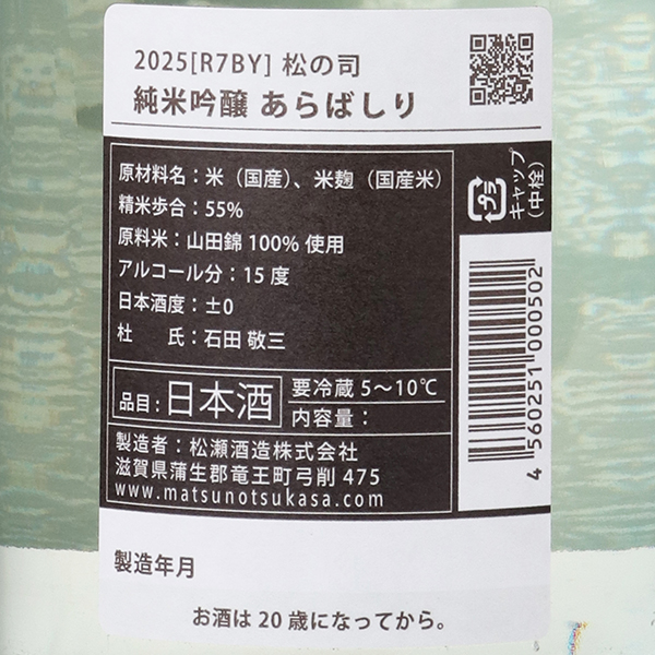 毎年、年末に最初の清酒としてリリースされる純米吟醸あらばしり。極限られた数量の季節商品でありながら、松の司純米吟醸の一つの顔として愛されて来たお酒です。搾りの最初に出てくる荒走りにあやかって、その年の酒造りの最初に蔵出しされる清酒ということから名付けられています。通常商品の純米吟醸の繊細なバランスはそのままに、生酒らしい旨味とフレッシュ感、そしてリンゴなどを思わせるさわやかな果実味がスッと口の中に染み渡ります。上品で透明感のある味わいと香りをお楽しみください。