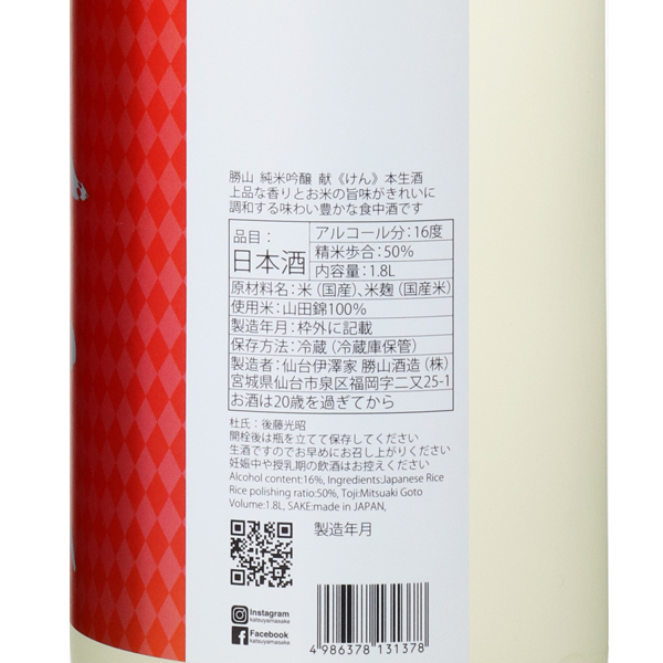 仙台で現存する唯一の伊達家御用蔵元禄元年、1688年に伊達政宗公を藩祖とする伊達家六十二万石の城下町仙台にて創業。その後、320年以上の間酒造りを続けている由緒ある酒蔵です。蔵のある地域は、お米を中心とした穀倉地帯で、泉ケ岳から湧き出る水は、勝山の仕込み水として深井戸より汲み上げ使用しています。水質は酒造りに適した軟水で、美人成分の天然シリカを多く含む、柔らかくキレイな水質となっています。勝山酒造のお酒は純米酒のみに特化しており、1週間にタンク1本の贅沢な仕込を行っています。様々な料理との相性が良く、多様な飲み方を楽しんで頂けます。