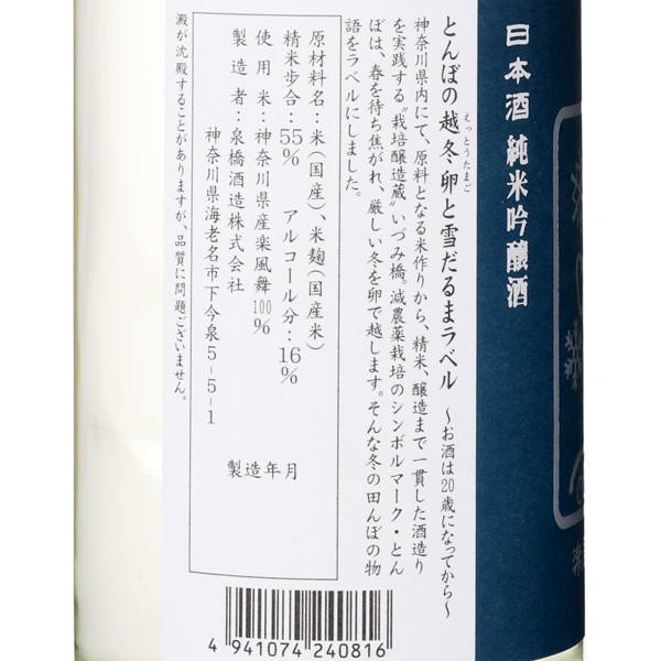 酒造りと米作り、どっちも本気です!…地元の田園風景を守る全量純米蔵泉橋酒造は江戸安政4年、1857年創業。県内有数の穀倉地帯である海老名耕地に蔵を構え、地元の農家と共に潤沢な米と丹沢山系の伏流水という2つの恵みを生かした酒造りを始めました。現在蔵で使用する酒米は9割以上が地元の契約栽培及び自社栽培米です。日本酒は醸造物であるだけではなく、農業副産物であると考え、米作りから酒造りを実践していく栽培醸造蔵としての歩みを進めています。無農薬や低肥料、冬期湛水など田んぼの健康を守り環境負荷を減らす栽培にも取り組んでいます。そんないづみ橋のお酒のラベルには自然環境に寄り添った農業を象徴する存在として、とんぼが蔵のシンボルとして度々登場します。太陽と大地の恵みをいっぱいに受けて育んだ信頼ある地元の米を丁寧に仕込む。海老名耕地の2000年を超える歴史と、自然の恵みを美味しいお酒で伝えていきます。