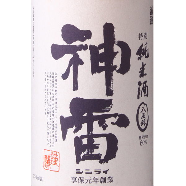 課せられた使命は、先人たちが築き上げた清酒という文化を伝承し、生活の潤いを、人生の喜びと悲しみを、共に味わっていくこと1716年創業。酒銘の神雷の由来はその昔雷が酒造蔵に落ちたが、大過なかったこと、また神石にあやかった事から。ちなみに稲妻は稲の妻と書くとおり、豊かな恵みをもたらす象徴であることから、大変縁起の良い名前です。酒蔵は中国山脈の山あい、標高500mに位置し、冬場は氷点下を記録します。さらに夏場も涼しいため、お酒の仕込、貯蔵共に大変適した環境が整っています。また、裏山の井戸から軟水、蔵の地下からは中硬水が得られ、用途によって使い分けが出来るのも特徴となっています。