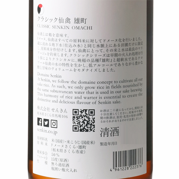 地元さくら市で、仕込み水と同じ水で育った米ドメーヌさくら雄町を使用。晩生品種である雄町と超軟水である仙禽の仕込み水、それぞれの特性をいかし、酸味と甘味のボリュームを現代化。ワイルド、かつ、エレガント。フレッシュで果実感の強い清々しい香り。アカシアやライチの香りの奥にあるのは、落ちついた輪郭のあるミネラル感。ひと口含むと調和のとれた酸味と甘みがひろがります。仙禽(せんきん)クラシックシリーズ:仙禽の酒質の特徴である酸味と甘味を上質に、控えめにまとめる。旨味主体の味わいの構成となり、香りはおだやか、味わいはスマートで旨味重視なため、総体的に一歩下がって料理をサポートする酒質。乳酸が主体のため、温度帯は常温付近で、和食や出汁中心の料理との相性が良い。