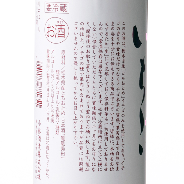 全国的に有名な栃木県のブランドいちご「とちおとめ」を全量使用した贅沢なリキュールです。酵素の力を用いた新技術を採用し、つぶつぶした食感や華やかな香りなど、いちご本来の自然な姿を感じることができます。そして、さらに美味しさを追究した結果、ほんのり懐かしく親しみやすい甘くミルキーな味わいに辿り着きました。普段お酒が苦手な方にも気軽にお楽しみいただけます。生のまま充填していますので、開封前の要冷蔵で賞味期限は2ヶ月となっております。フレッシュな味わいをお楽しみ頂くためにも、冷蔵庫にて保存をお願いいたします。
