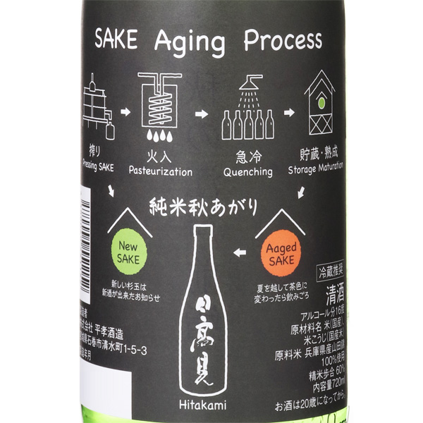 兵庫県産山田錦を使用し宮城酵母で醸した日高見の秋あがりです。ほのかに香る爽やかな香りと、山田錦が持つ芳醇な味わいがあり、半年間熟成させることで、柔らかみが増して呑みやすい優しい仕上がりになっています。日髙見が自信を持って造る秋酒を、秋刀魚の塩焼きや、鰹のたたき、きのこのクリームスープ、秋の江戸前鮨など旬の食材を活かした料理と共にお召し上がりいただくのもおススメです。冷やして頂くとスッキリとお楽しみいただけ、ぬる燗(人肌燗)で更に柔らかみが増します。秋あがりができるまでの製造工程をフローチャートにしたラベルを眺めつつ、秋の夜長をお楽しみください。