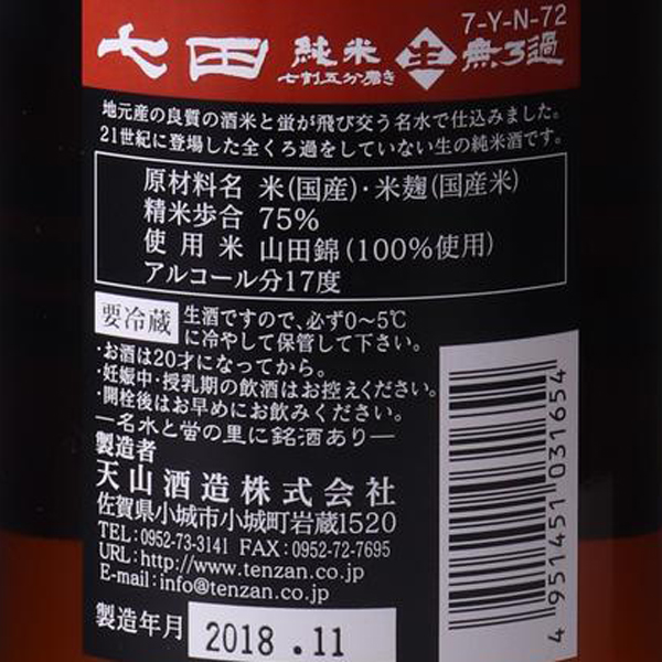 こだわりは天山伝統のDNA天山酒造は文久元年、1861年創業。酒蔵の前を流れる祇園川は天山山系の水を集める清流、源氏ボタルの発祥の地です。天山の仕込み水にはこの秀峰・天山の中腹から清冽な湧き水を専用の水道で蔵まで導き使用しています。この天山の伏流水は酒造りにとっては理想的な名水で鉄分が無く、しかもカルシウムやマグネシウムといったミネラル分を含んだ硬水です。そのため比較的マイルドな酒質の多い佐賀県において、天山ではしっかりとした味わいの男酒がうまれます。平成15年からは人・米・酒(じんまいしゅ)プロジェクトをスタート。地域の人と酒造りを結びつけ、日本酒という文化を次代に伝えていく働きをしています。その他にも佐賀県一万人で乾杯プロジェクなどを企画、先代から引き継いだ理念「不易流行」を掲げ、常に攻めの姿勢で酒を造っています。