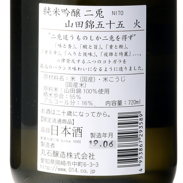 「二兎追うものしか二兎を得ず」をコンセプトに、味と香、酸と旨、重と軽、甘と辛、入りと後味、複雑と綺麗…など、一見すると二律背反する二つのコトガラが最高のバランス・味わいになるように造っています。山田錦を55%まで磨き上げました。飲み始めに感じるジューシーな甘さを、しっかりとした酸味が上手に支えています。余韻は味わいの主張とは対照的に引き締まったミネラル感と共にスッと消えていきます。