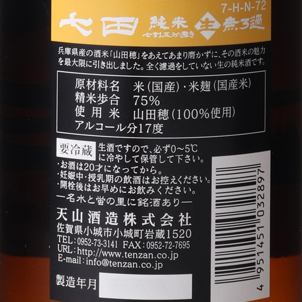 七田 純米 山田穂 七割五分磨き 無濾過生