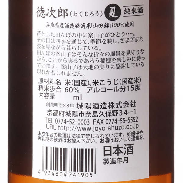 小川流れる田園風景のラベルが涼を育み、ほっこりとさせる徳次郎の夏純米は兵庫県産 山田錦を100%使用しています。爽やかな香りと、鮮烈でフレッシュな香味、スッキリとしたキレのいい酸味が心地よい瑞々しく綺麗な味わいです。夏の食材を使った料理に是非合わせてお召し上がりください。蔵紹介