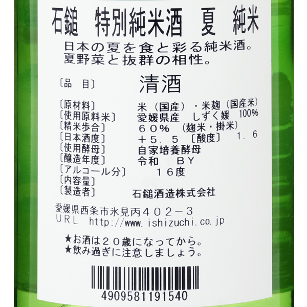 愛媛県産 しずく媛を使用し米の持ち味を充分に引き出した夏純米。早熟のメロンの様な吟香に繊細な米味が広がり、ハリのある酸で滑らかにキレていきます。石鎚は食中酒としての位置づけになるよう設計しています。こちらの夏酒は夏の暑い日に、トマトやナス等夏の食材と一緒に、ぜひキリリと冷やしてお愉しみください。蔵紹介
