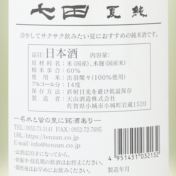 夏にすっきりと飲めると同時に美味しさをしっかり感じられるよう、アルコール度数を14度台に加水調整していますが、原酒の旨味や酸をしっかりとパワーアップさせて、スッキリとした中にも「七田」らしさを感じさせてくれます。マスカットや夏みかんを思わせる爽やかな香り。例年より爽やかな香りと共にサラっと飲める味わいに仕上がっています。蔵紹介