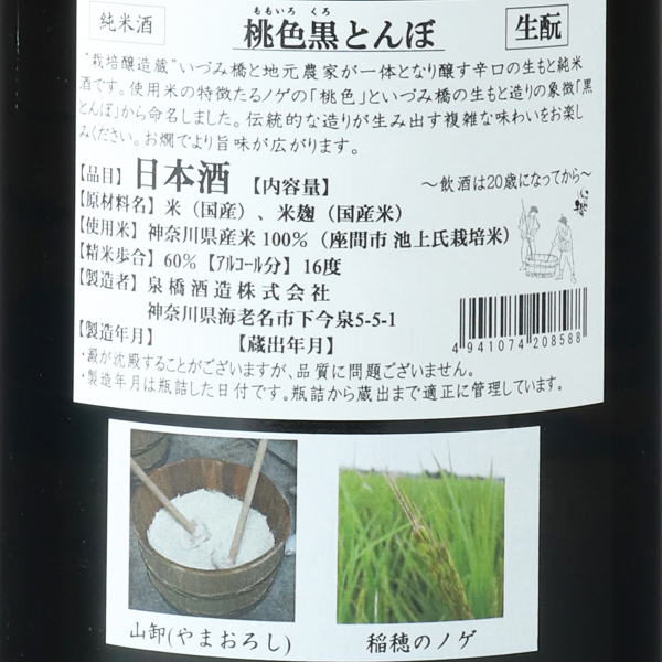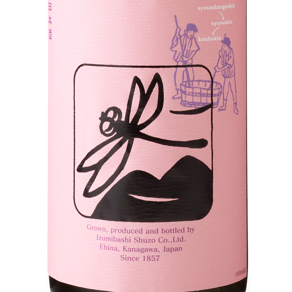 栽培醸造蔵・いづみ橋と地元農家が一体となり醸す辛口の生もと純米酒です。使用米神力の特徴であるノゲの「桃色」といづみ橋の生もと造りの象徴「黒とんぼ」から命名しました。伝統的な造りが生み出す複雑な味わいをお楽しみください。お燗にすることで、よりいっそう旨味を感じられます。蔵紹介