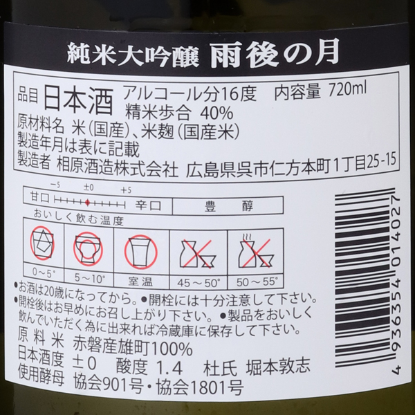 まずは自分が飲んでうまい酒明治8年創業。広島県呉市の東にある、山と瀬戸内海に挟まれた小さな町で酒造りをしています。戦争で一時休業になったものの今までずっと酒造りを続けてきました。自分が飲んでうまい酒をまずはつくらねばと昭和63年に品質第一を徹底し、吟醸蔵へと生まれ変わりました。大吟醸造り、全品冷蔵保存、最上の原料で醸すことを掲げ、どうすれば美味しいかを常に考えています。そんな蔵元の代表銘柄雨後の月はとうふ、天ぷらを塩、白魚の焼き物などさっぱりした料理にあわせやすいとのこと。その時の季節に合わせて、雨後の月を楽しんでください。
