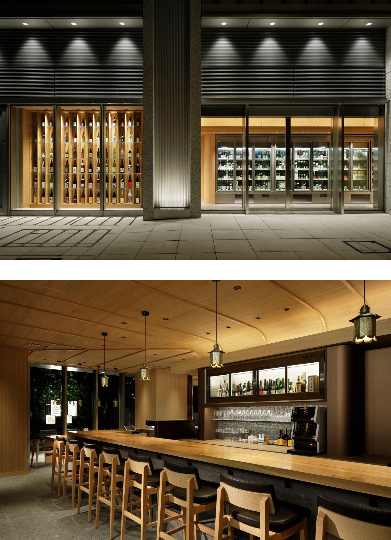 伝統の地で、今の日本酒を楽しむ 10台の大型冷蔵庫が並ぶ小売スペースと、飲食スペースからなる初の飲食併設店舗として、2018年にオープンしました。店内のインテリアは天井のやわらかい曲線が窓の外の福徳神社と一体感を演出。カウンター上に配置した鍛金師・伊藤祐嗣さんの作品である鍛金の灯具や、酒造り発祥の地と言われる「三輪」の大神神社の杉玉など、こだわりが詰まった空間です。 日本橋という伝統ある地で、日本酒、焼酎、和のリキュールを中心に約700種類の商品を四季折々にご紹介します。ランチの博多うどんもぜひ一度お試しください。 |